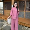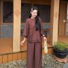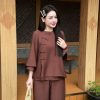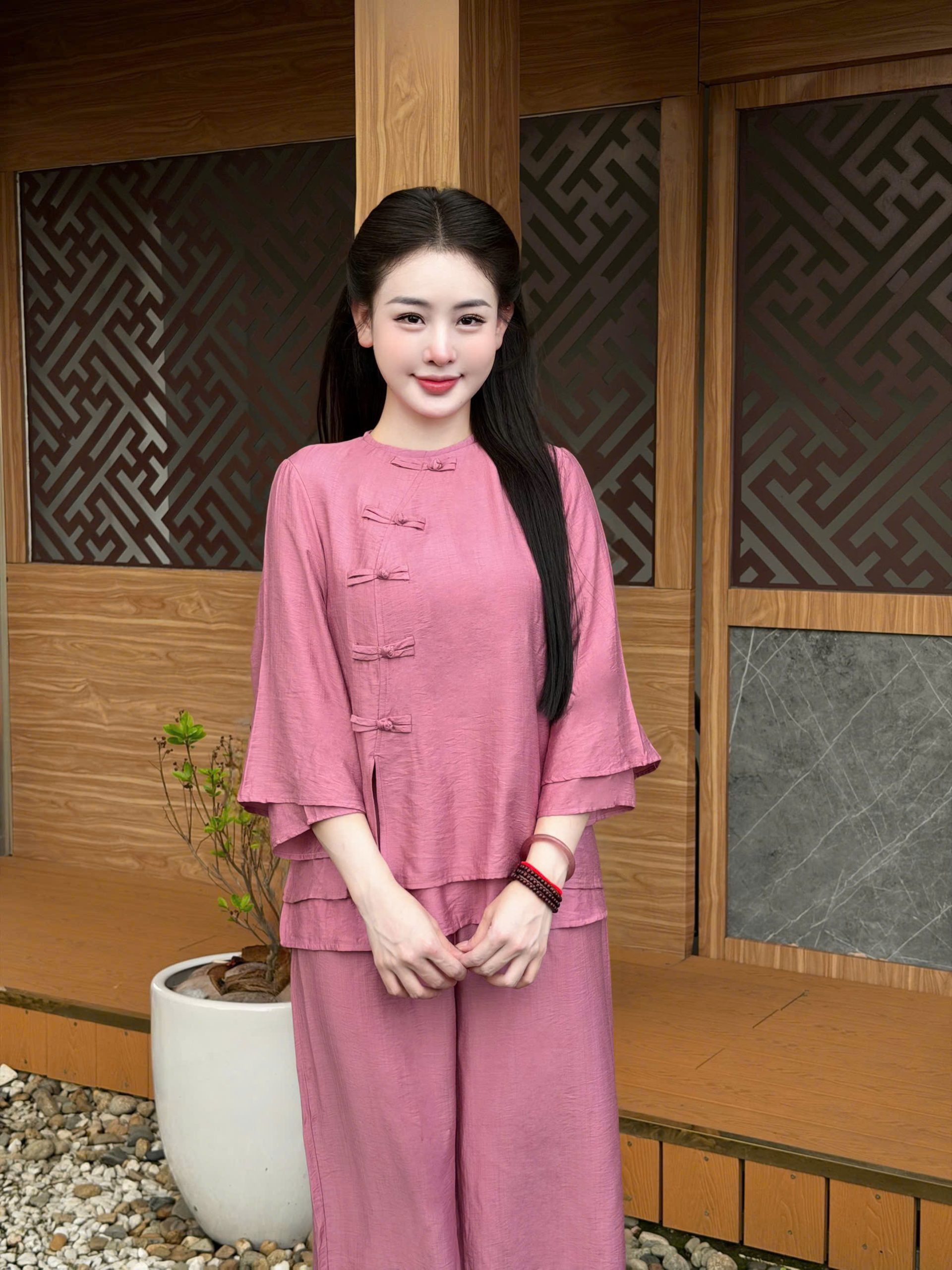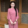 Một bộ pháp phục đẹp không chỉ nằm ở kiểu dáng, mà còn ở cảm giác nhẹ nhõm khi khoác lên mình. Thương hiệu Sen Hồng mang đến thiết kế vạt chéo cách điệu trên nền chất liệu đũi tơ, giúp nàng tự tin, thanh thoát trong mọi nghi lễ hay những buổi trà thiền.